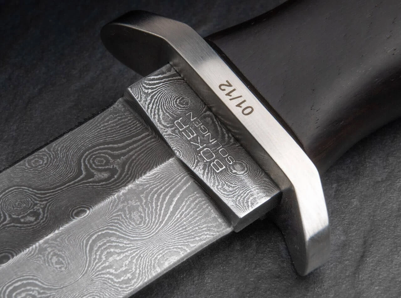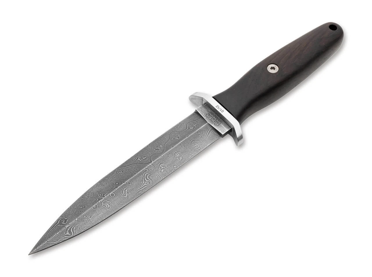 Das Böker Applegate-Fairbairn hat mittlerweile den Status einer echten Ikone erreicht und überzeugt in seinen verschiedenen Ausführungen seit Jahren Einsatzkräfte auf der ganzen Welt. Selbstverständlich darf es in der exklusiven Serie der Böker Dampfmaschinen-Damast Modelle daher nicht fehlen. Das stabile Messer wurde von Col. Rex Applegate entworfen, der während des Zweiten Weltkriegs geheime Operationen in ganz Europa koordinierte und sogar zur persönlichen Bewachung von Präsident Franklin D. Roosevelt eingesetzt wurde. Die Griffschalen bestehen aus zertifiziert importiertem Grenadillholz, während die Klinge aus dem einzigartigen Dampfmaschinen-Damast gefertigt wird. Handgefertigt in Solingen und streng limitiert auf 12 Exemplare weltweit. Die Auslieferung erfolgt in einem exklusiven Rahmenetui. Mit hochwertiger Lederscheide und Echtheitszertifikat.
