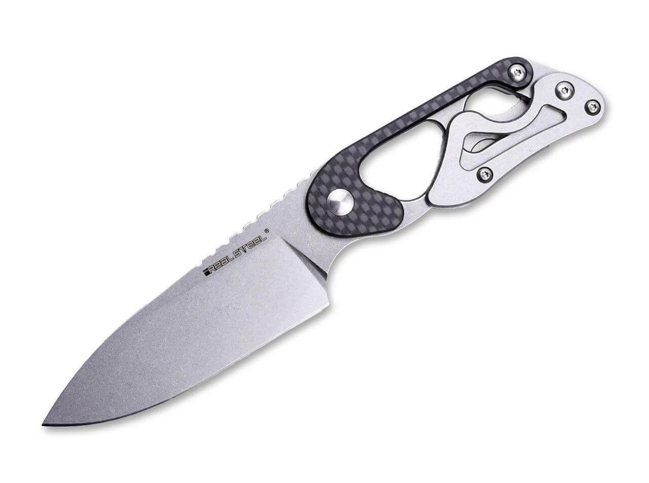 Das weiterentwickelte Cormorant Apex von Real Steel ist ein innovatives feststehendes Messer, das aufgrund des variablen Griffs mit einem breiten Einsatzspektrum glänzt. Das kompakte Messer kann problemlos als leichtes EDC oder auch Neck Knife getragen werden, bietet mit ausgeklappter Verlängerung aber die komfortable Handlage eines deutlich größeren Messers. Gefertigt wird die Ganzstahlkonstruktion mit Stonewash-Finish aus 14C28N, der skelettierte Griff mit Schalen aus Kohlefaser reduziert das Gewicht zusätzlich. Mit praktischer Kydex-Scheide.