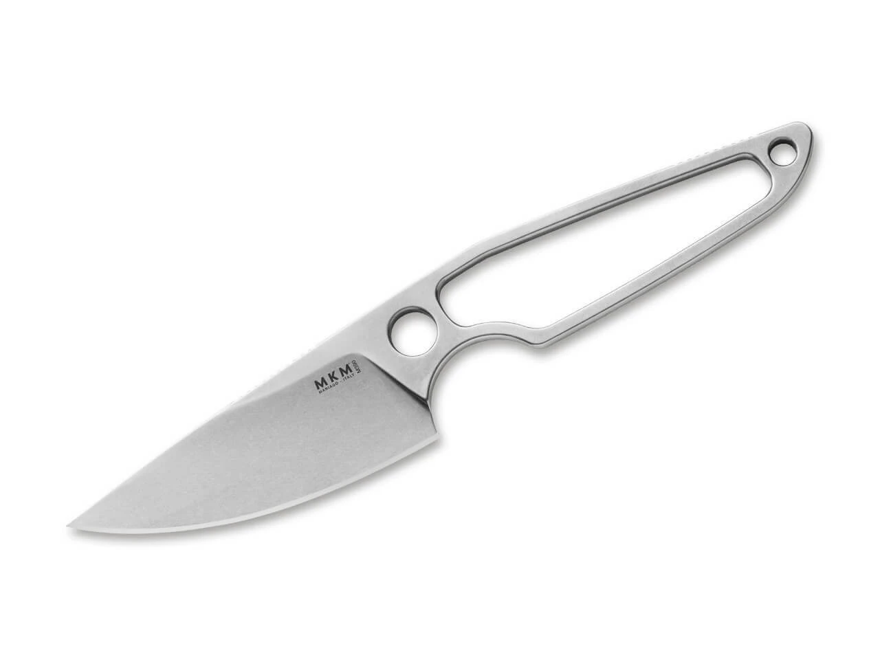 Die ausgewachsene Variante des beliebten MKM Mikro punktet mit einer Droppoint-Klinge aus Böhler M390 und wird von Designer Jesper Voxnaes ohne Griffschalen versehen. Das Skelettmesser trotzt mühelos schwierigen Schneidarbeiten und wird mit einer hochwertigen Lederscheide geliefert.