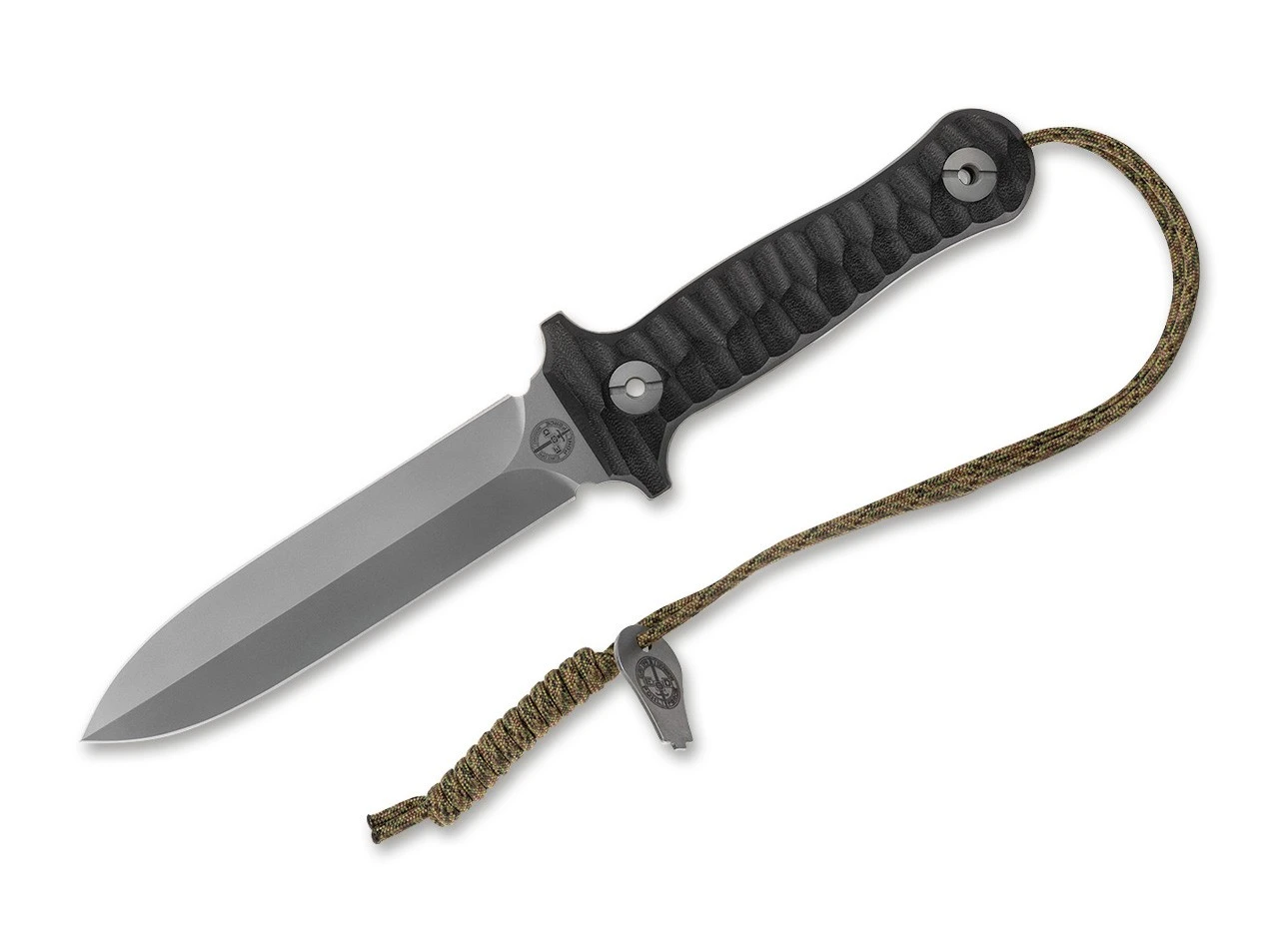 Das Pohl Force MK7 ist die überarbeitete Version des legendären Romeo One. Der beidseitig abgezogene Dolch ist mit rutschfesten Griffschalen aus strukturiertem G10 ausgestattet, die mithilfe des beiliegenden Schlüssels ohne großen Aufwand demontiert werden können. Der darunterliegende Hohlraum lässt sich optimal als Stauraum für verschiedene Survival-Utensilien nutzen. Die Klinge wird aus Niolox gefertigt und ist mit einer nicht reflektierenden, sandgestrahlten Oberfläche versehen. Mit sandfarbener Kydex-Scheide und Lanyard. Zum Lieferumfang des streng limitierten Messers gehört neben dem Zertifikat auch eine Tasche, in der das Messer sicher und verschließbar aufbewahrt werden kann.