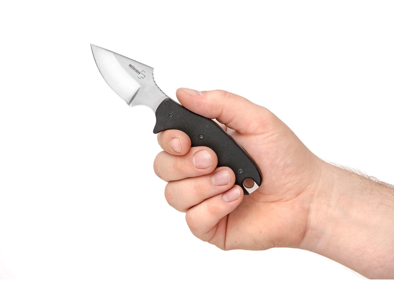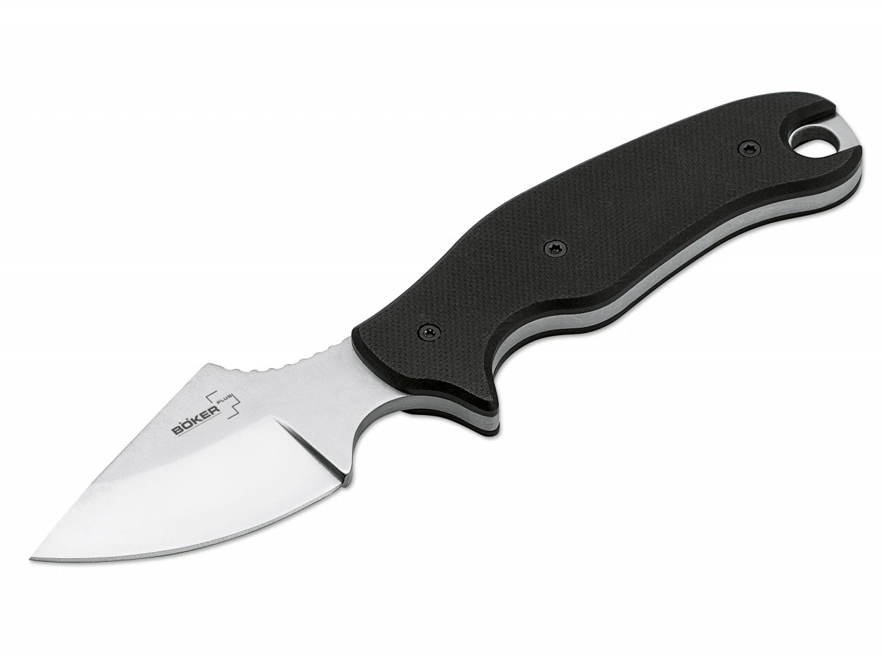 Die ungewöhnliche Kombination von vollwertigem 4-Finger-Griff und einer eher kurz gehaltenen Klinge bringt bei beim Böker Plus Tac-Neck von Christian Strauss gleich mehrere Vorteile mit sich. So ist einerseits ein komfortableres Tragen als Neck Knife möglich, ohne jedoch andererseits Einbußen bei der Ergonomie hinnehmen zu müssen. Auch die ausgezeichnete Klingenkontrolle und die effektivere Kraftübertragung machen den Gebrauch zu einem echten Vergnügen. Die ausgeprägten Mulden für Zeigefinger und Daumen ergeben zudem eine extrem sichere Handlage und ermöglichen kraftvolles Arbeiten. Der Griff ist mit rutschfest strukturiertem G10 beschalt und besitzt eine große Fangriemenöse. Lieferung mit Kydexscheide und Kugelkette.
