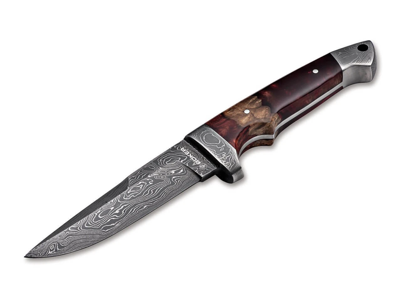 Das beliebte Böker Vollintegral ist seit vielen Jahren ein nicht mehr wegzudenkender Bestandteil unseres Sortiments, und gleichzeitig eine Ikone unter den Böker-Jagdmessern. Das stabile Messer wird in dieser besonders edlen Variante aus einem massiven Stück Damast im Gesenk geschmiedet, das Ausgangsmaterial besteht dabei aus 150 Lagen handgeschmiedetem, rostträgem Damast von Chad Nichols aus Mississippi. Die Klinge ist mit einem Flachschliff versehen, der die Stabilität maximiert. Die polierten Griffschalen mit atemberaubendem Tiefeneffekt bestehen aus einem Hybridmaterial, das aus zertifiziert importiertem, stabilisierten Amboinaholz und rotem Harz gefertigt wird.